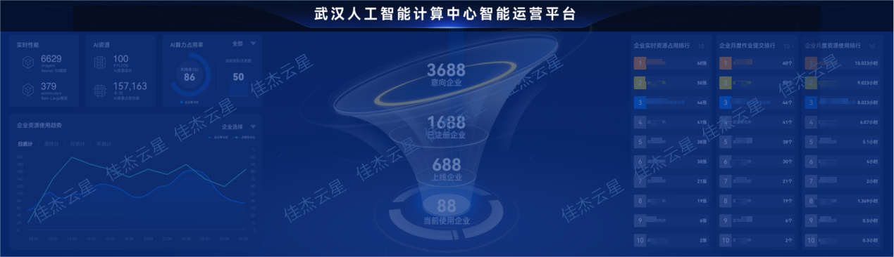 佳杰云星通过多样性算力统一运营调度管理平台将通用算力、AI智算、HPC超算进行统一管理运营,将武汉人工智能计算中心建设为算力开放、安全可靠、面向公众服务的多样性算力服务平台。